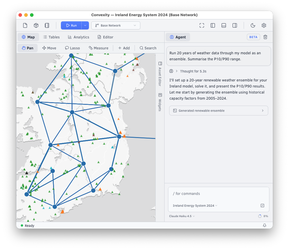Convexity's agent can build, edit, and run your models for you. Describe what you need in plain language — add assets, run sensitivities, generate charts, or set up entire country models from scratch. It operates directly on your model, executing tasks faster than the best modelling teams can today.